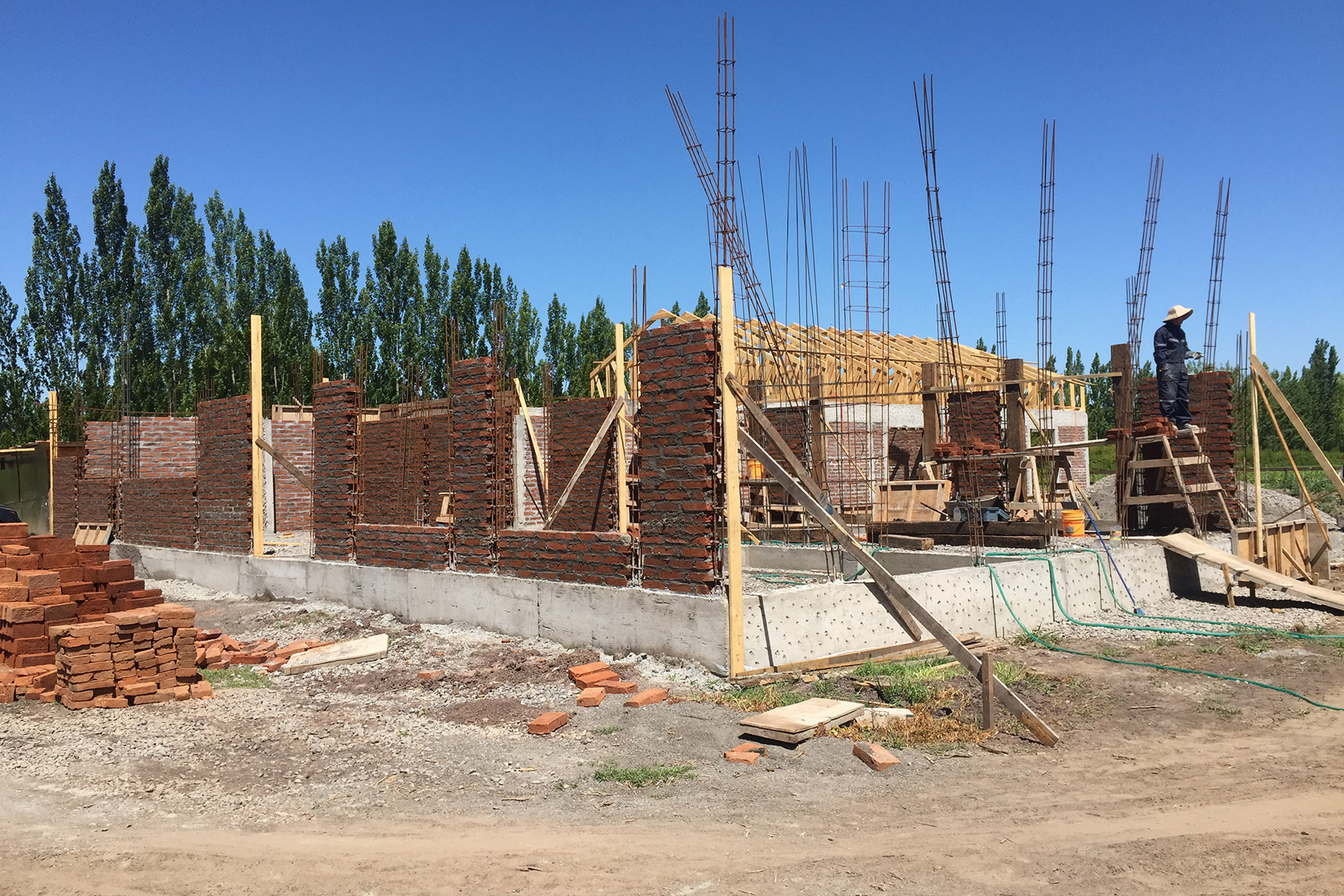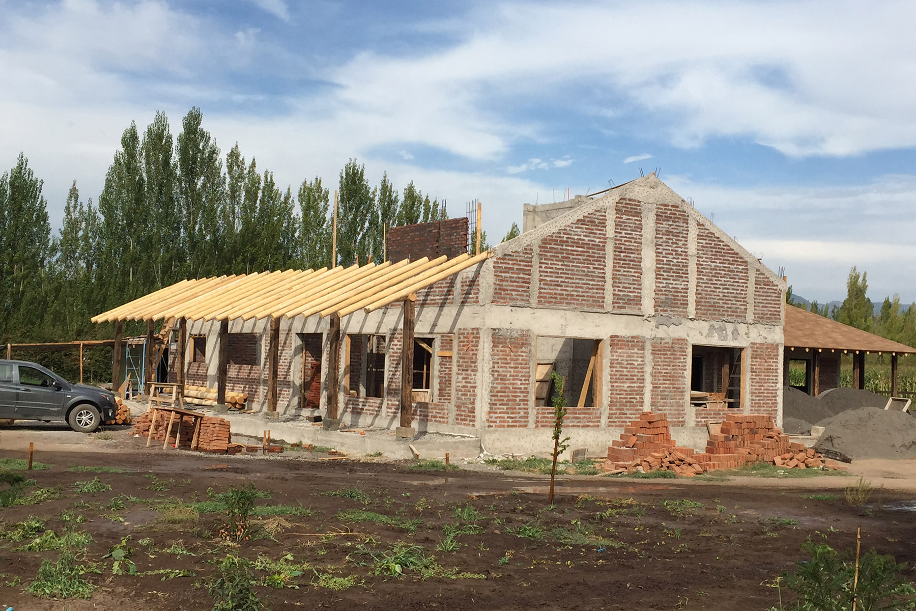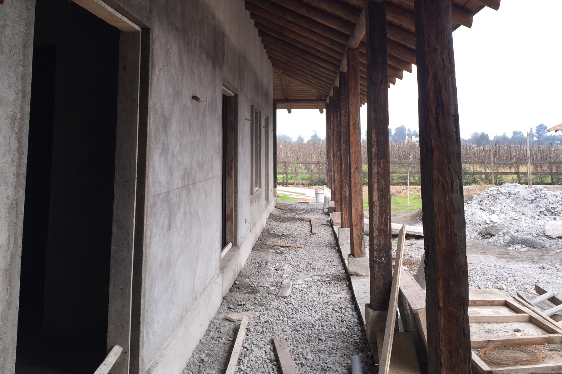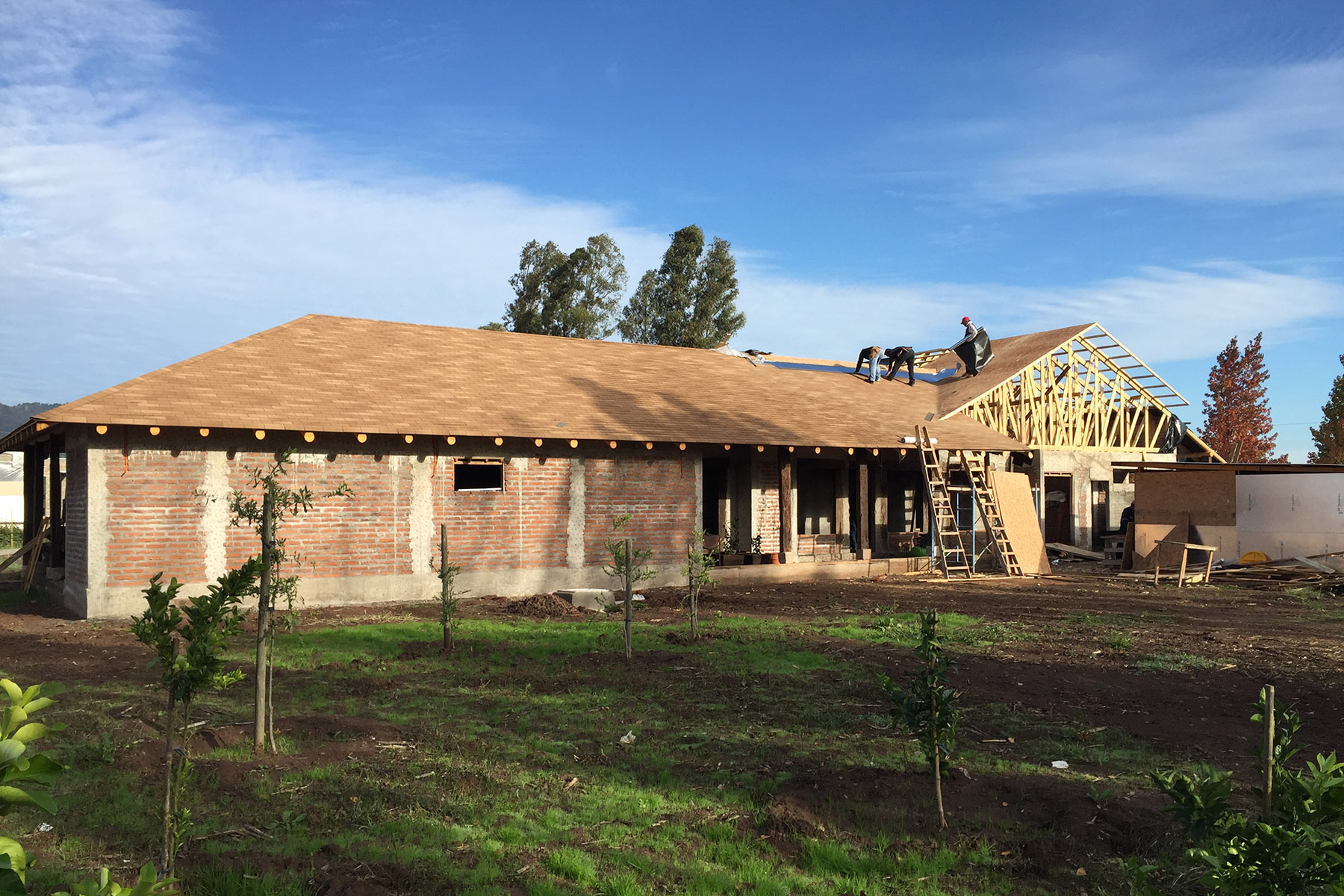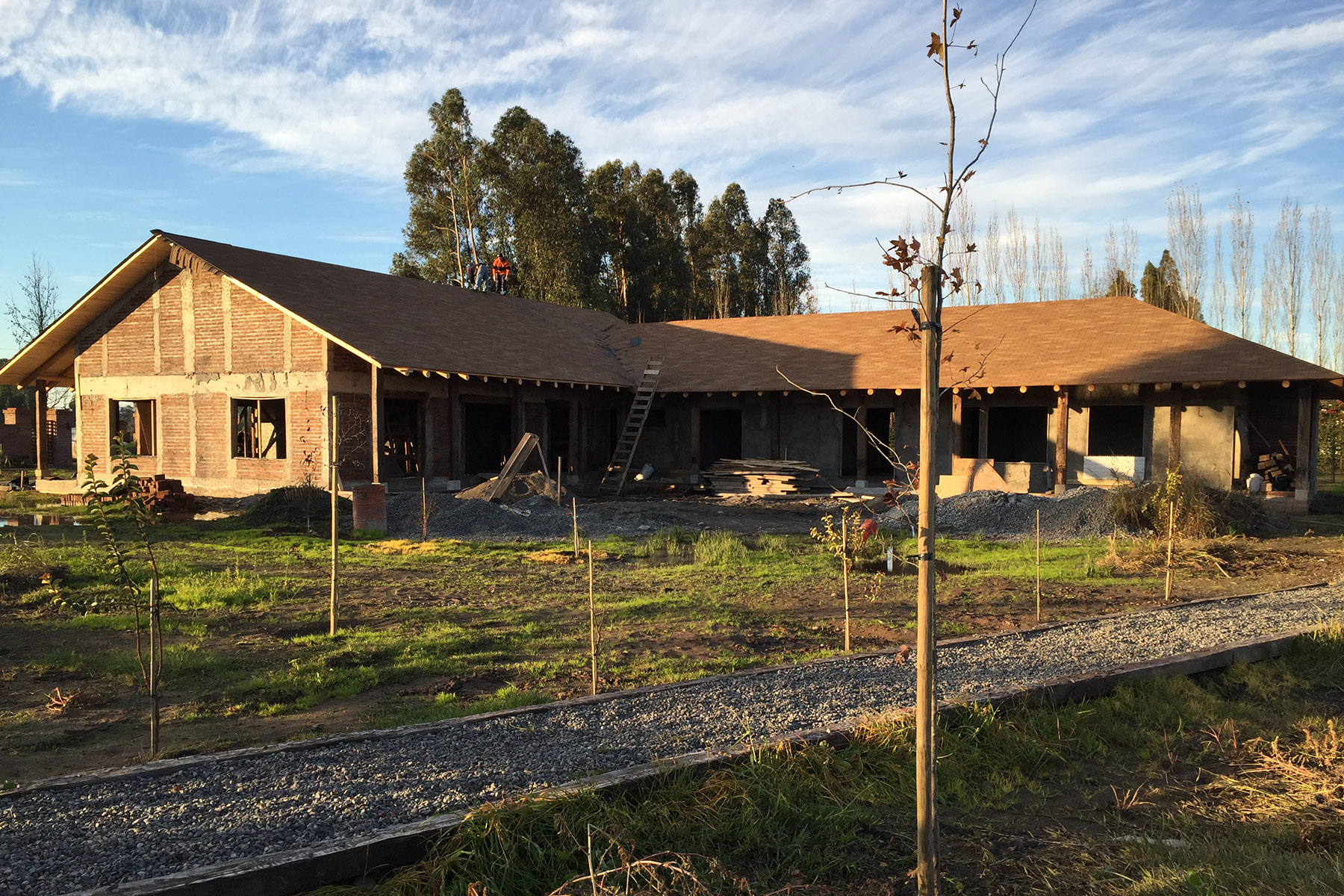 Estructura de albañilería confinada, pilares de madera nativa, techos con vigas de pino a la vista, y cubierta de teja asfáltica.